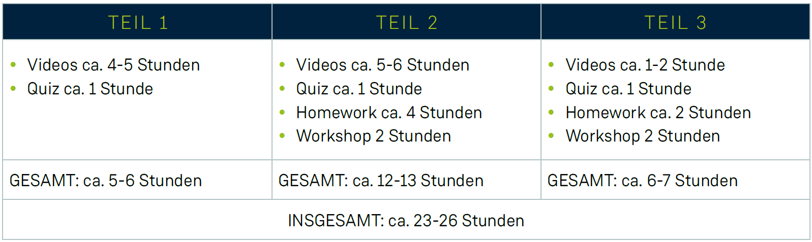 Sie lernen flexibel und in Ihrem eigenen Tempo – je nach verfügbarer Zeit lässt sich das Seminar in etwa 1 bis 3 Monaten absolvieren. Hier geben wir ihnen einen Überblick, welchen Zeitbedarf Sie für die Teilnahme am eTraining Kurs einplanen sollten: