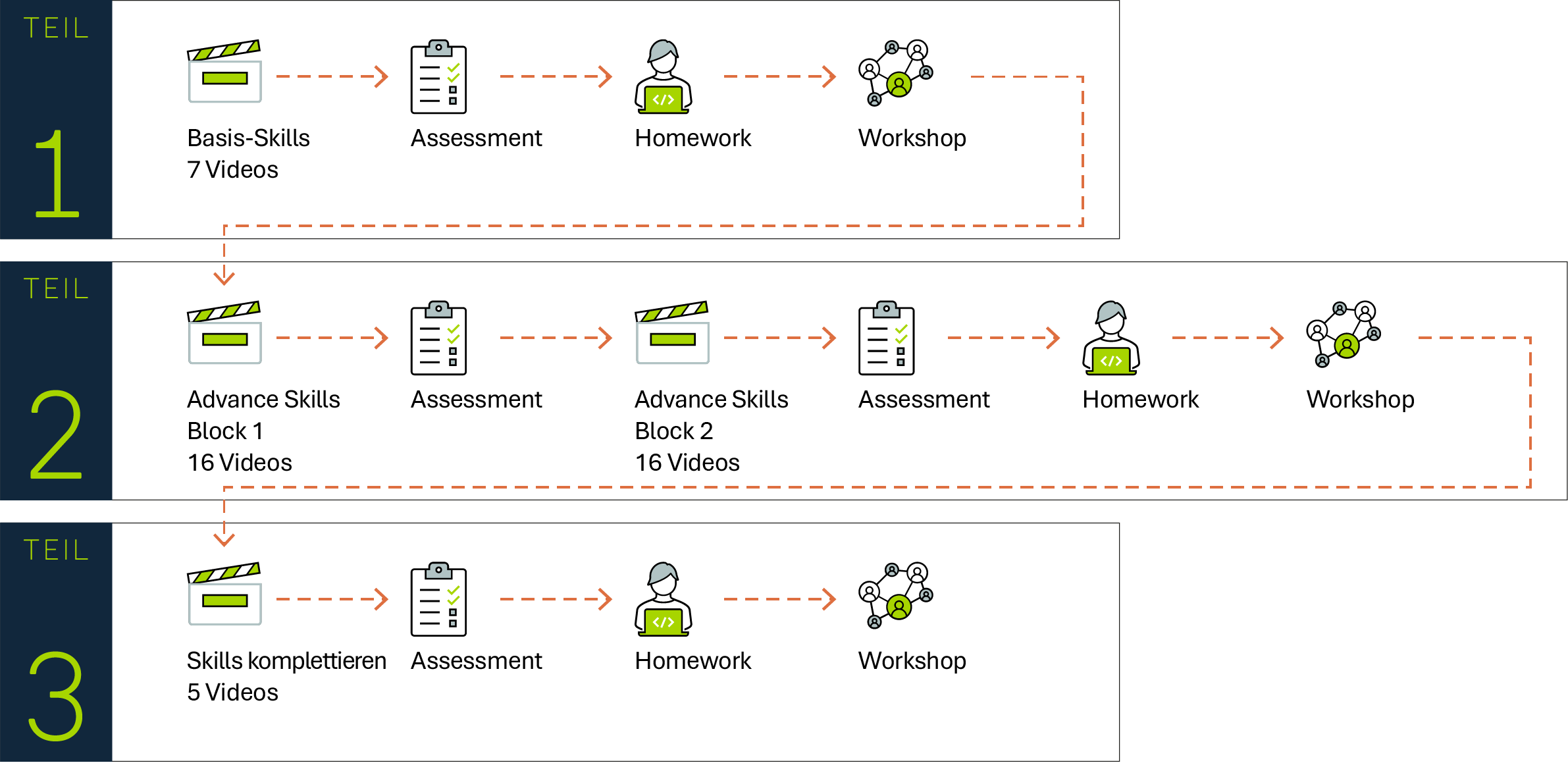 Sie bestimmen das Tempo: Sie wählen einfach für jeden Lernblock Ihren passenden Workshop-Termin aus. Die Reihenfolge der Blöcke ist verbindlich, da die Inhalte aufeinander aufbauen.
