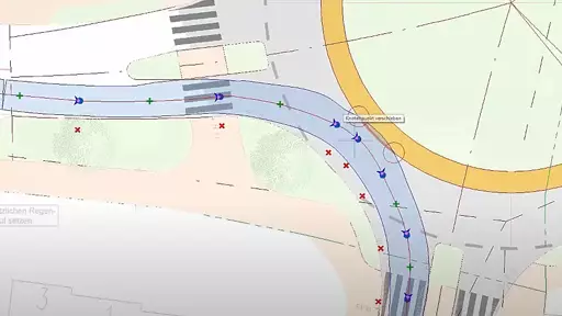 Sie können nun während der Fahrzeugsimulation die Form und Länge eines Weges durch Ziehen von Griffen und Setzen von Punkten manuell anpassen. Mit diesen verschiedenen Bearbeitungsfunktionen können Bogen- und Kurvenfahrten, sowie die Übersteuerung einfacher angepasst werden.