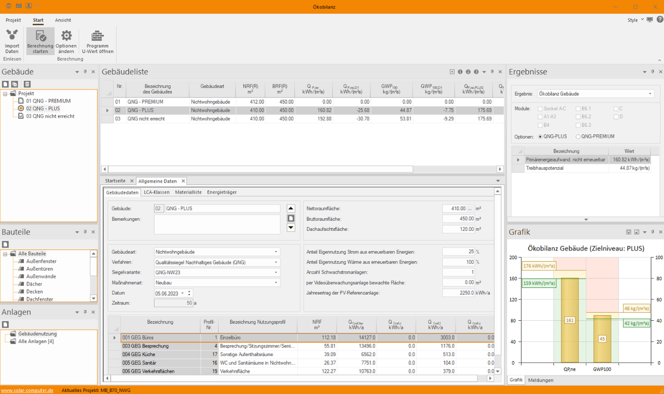 Die Software bilanziert den nicht erneuerbaren Primärenergieaufwand und das Treibhauspotenzial des Gebäudes über den gesamten Lebenszyklus. Neben der Bewertung von Großkomponenten und Anlagen werden auch der Energieaufwand für Betrieb, Nutzung und Entsorgung umfassend berücksichtigt. Die detaillierte Berücksichtigung aller Lebenszyklusphasen ermöglicht eine genaue und umfassende Nachhaltigkeitsbewertung.